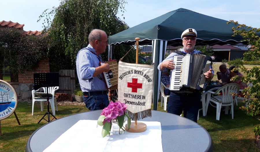 Der Garten von Familie Schlüter ist ein wahrer Traum. Überall kleine Ecken zum Verweilen, viel Sehenswertes aus Holz, Stein oder Schiefer, Wasserplätschern im Hintergrund und viele Blumen. „Da bietet es sich doch ein Gartenkonzert an“ so der Einfall von der Gartenbesitzerin und stellv. Vorsitzenden des DRK Ortsvereins Maike Schlüter. Der Ortsverein kann zurzeit die Senioren-Nachmittage in gewohnter Form leider nicht anbieten. Da kam der Vorschlag von Maike Schlüter gerade recht, ihren Garten zur Verfügung zu stellen. Aufgrund der Corona-Situation wurde das Event nicht veröffentlicht, lediglich 50 Senioren aus Jevenstedt und Umgebung wurden zum Konzert geladen. Bereits bei Kaffee und Kuchen, natürlich unter Einhaltung der zurzeit geltenden Hygienevorschriften, spielten die „Shantys“ leichte Hintergrundmusik. Nachdem sich die Senioren gestärkt hatten, konnte es bei einem leichten Cocktail losgehen. Der Shanty-Chor von 1871 aus Lütjenwestedt war mit kleiner Besetzung angereist um die Senioren zu unterhalten. Eine gute Stunde bei reichlich Sonnenschein und einem tollen Ambiente wurde richtig aufgespielt. Die Gäste waren in bester Laune und konnten die Lieder vielerseits mitsingen. Als Überraschungsgast schaute dann auch noch der Bürgermeister Sönke Schwager vorbei und gab einen kurzen Überblick über die akuellen Themen aus der Gemeinde. „Das war ein rundum gelungener Nachmittag“, so eine Seniorin aus Jevenstedt.